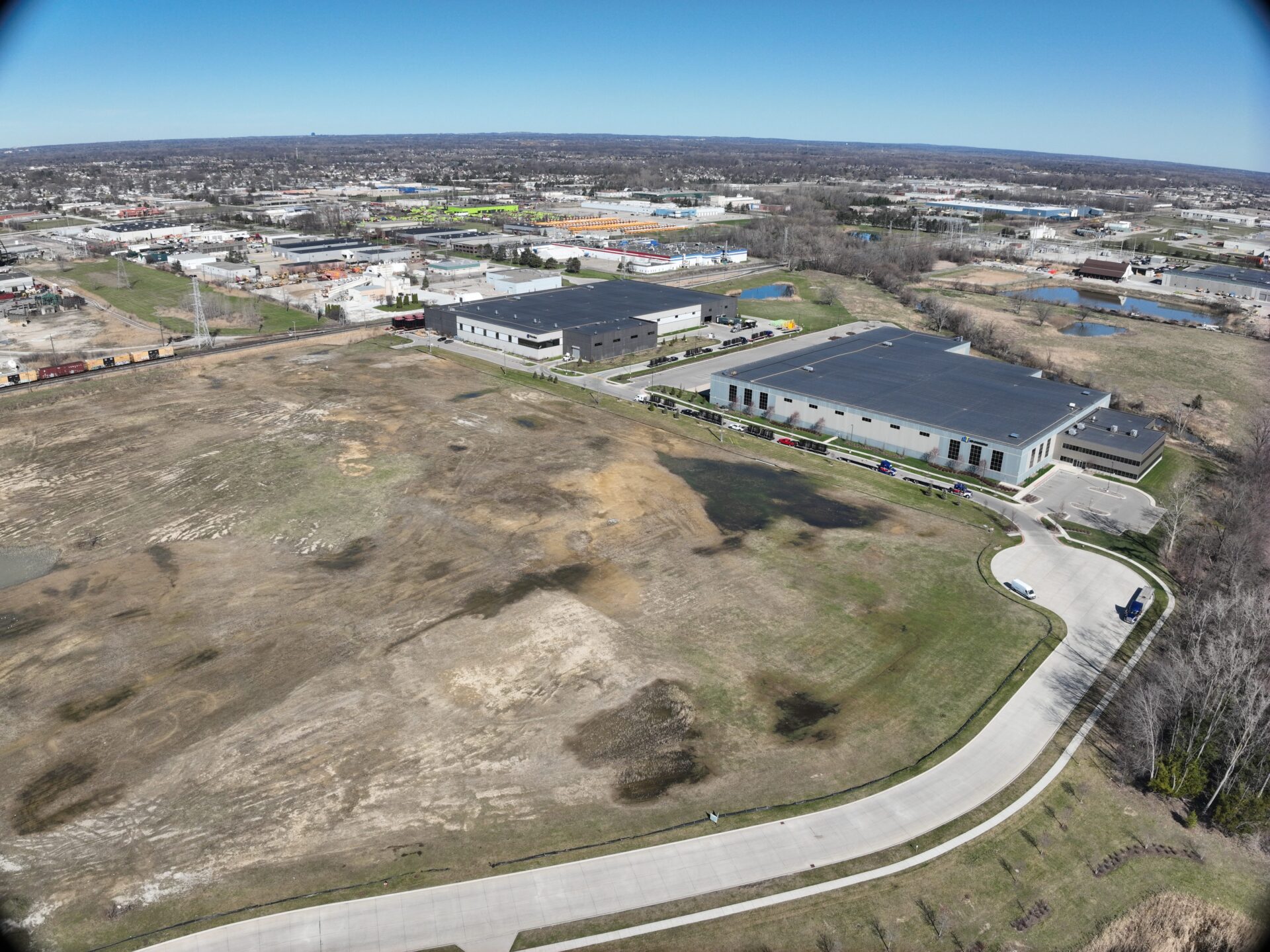 Sterling Enterprise Park is a 144-acre, rail served institutional Class A industrial park with 47.51 acres remaining. The site is 1,500 feet from State Highway M-53, 5 miles to I-75, 6 miles to I-696, and a Class 1 railroad borders the west property line with spur availability. This greenfield site has no wetlands or floodplains on site.
